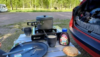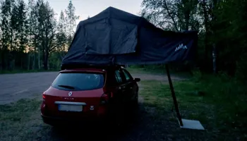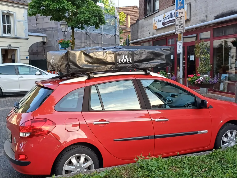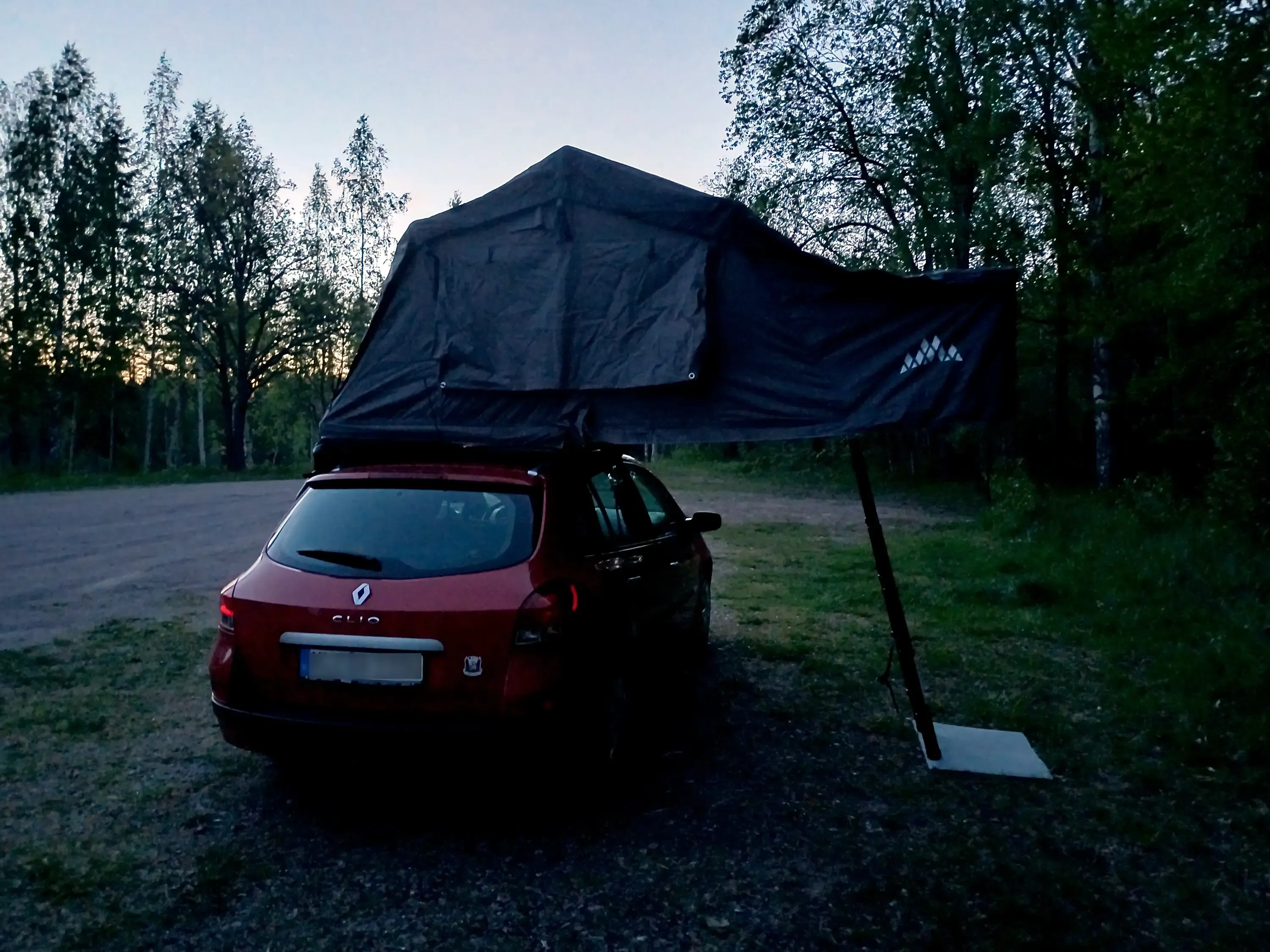 Anders als im letzten Jahr fahren wir nun nicht mit einem Peugeot Traveler, sondern mit unserem kleinen Clio Grandtour nach oben. Dreieinhalb Wochen auf kleinstem Raum. Und Dachzelt!