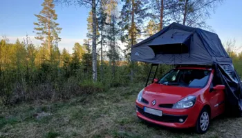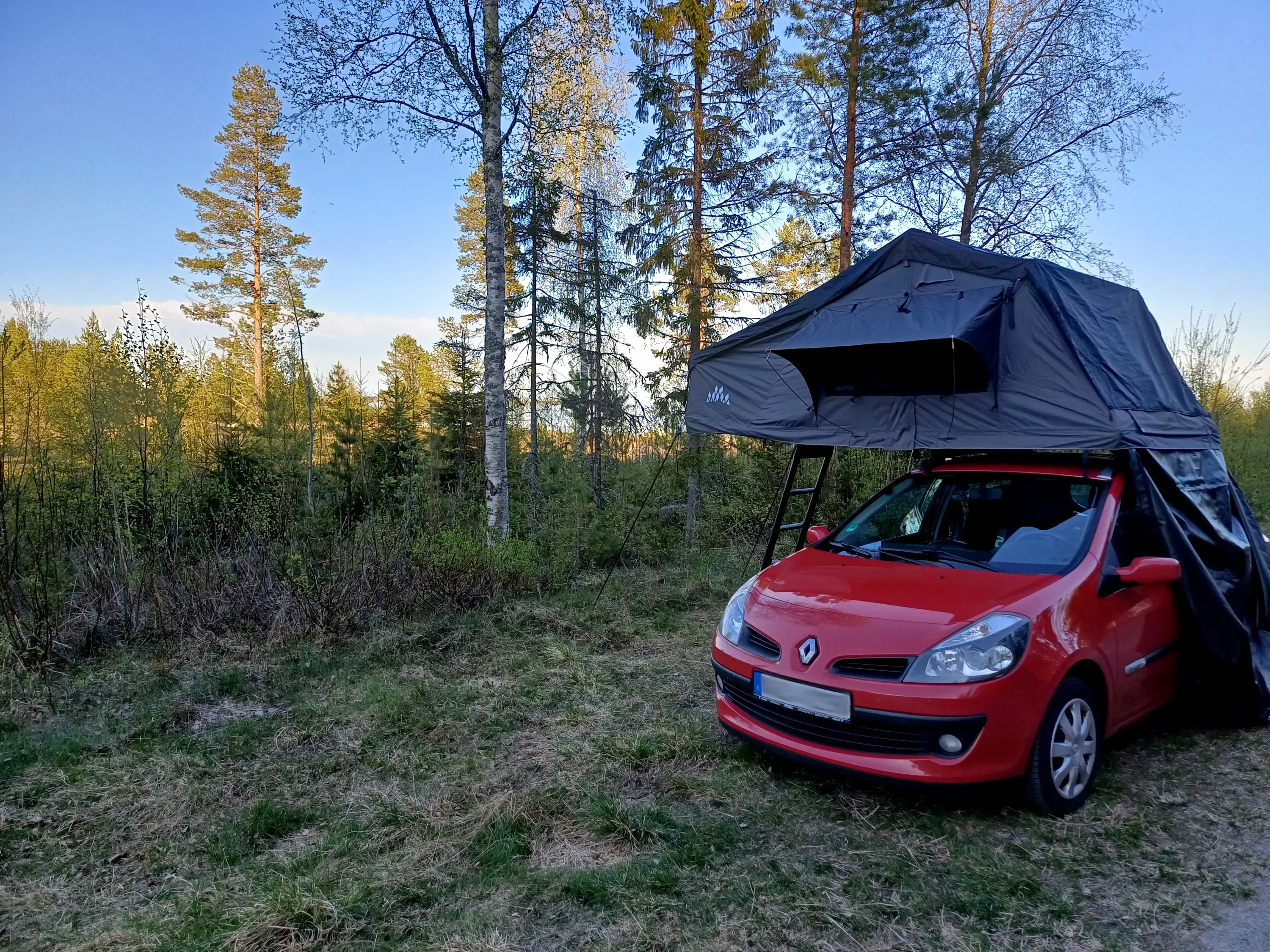 Anders als im letzten Jahr fahren wir nun nicht mit einem Peugeot Traveler, sondern mit unserem kleinen Clio Grandtour nach oben. Dreieinhalb Wochen auf kleinstem Raum. Und Dachzelt!